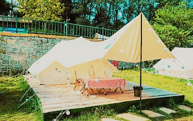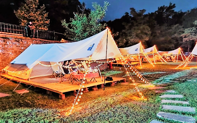 济南跑马岭(嗨king)野奢营位于山东省济南市历城区柳埠镇跑马岭景区内。是山东首家以“轻奢野外露营”为主题的野奢帐篷露营地,亲子互动、闺蜜聚餐、露天电影、高颜值美食大餐、保姆级贴心服务,更多网红玩法解锁户外美学新体验,填满生活仪式感。当天空挂着圆月与繁星三五亲朋在草地上撒欢,在帐篷里小憩,在炉火旁烧烤
