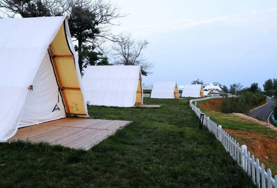 洛阳鹰嘴山景区位于新安县仓头镇王村村,东、北、西三面临水,视野开阔,形成总面积500余公顷的半岛。山缓土厚、岸边曲折、林丰草密、鸟语花香。鹰嘴山TIPPI营地便位于此绝佳宝地,从市区驱车一小时便可抵达,赏日落、观水景、在山顶漫步,享受着人为设计参与自然的惬意美好。
